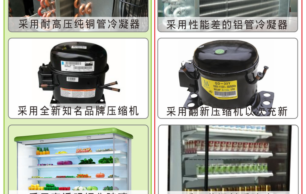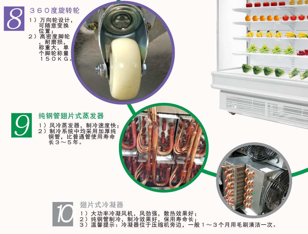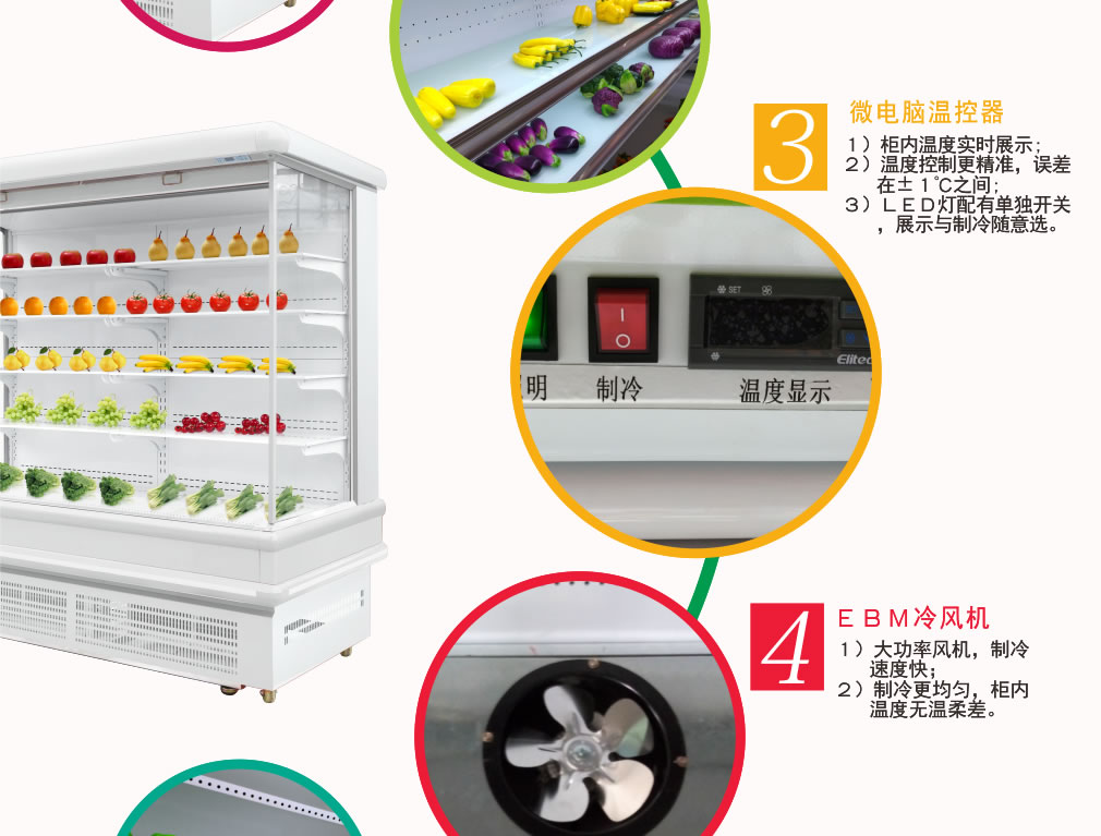 ① 風(fēng)扇或空調(diào)出風(fēng)口不能正對(duì)敞口式冷柜吹風(fēng);