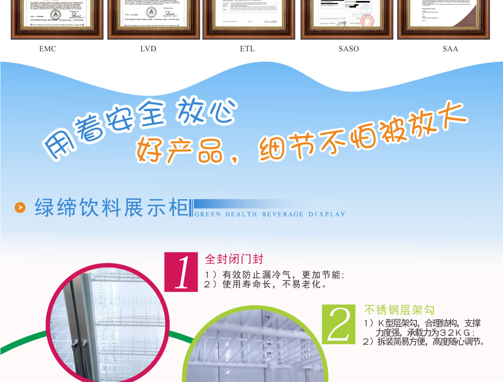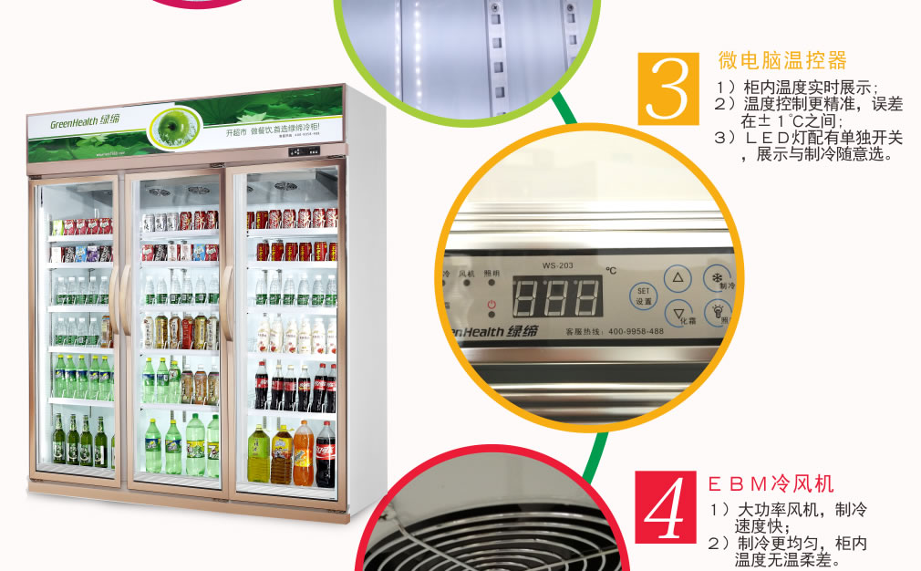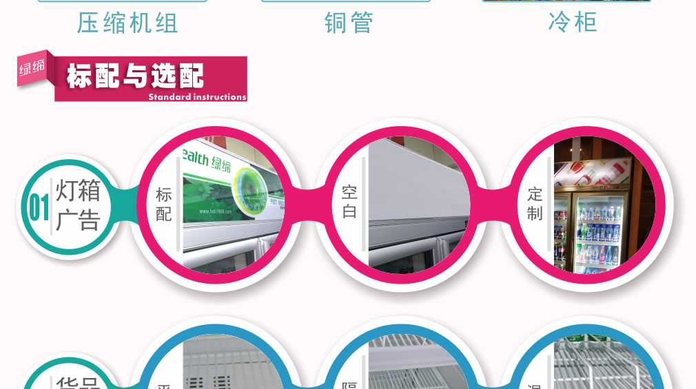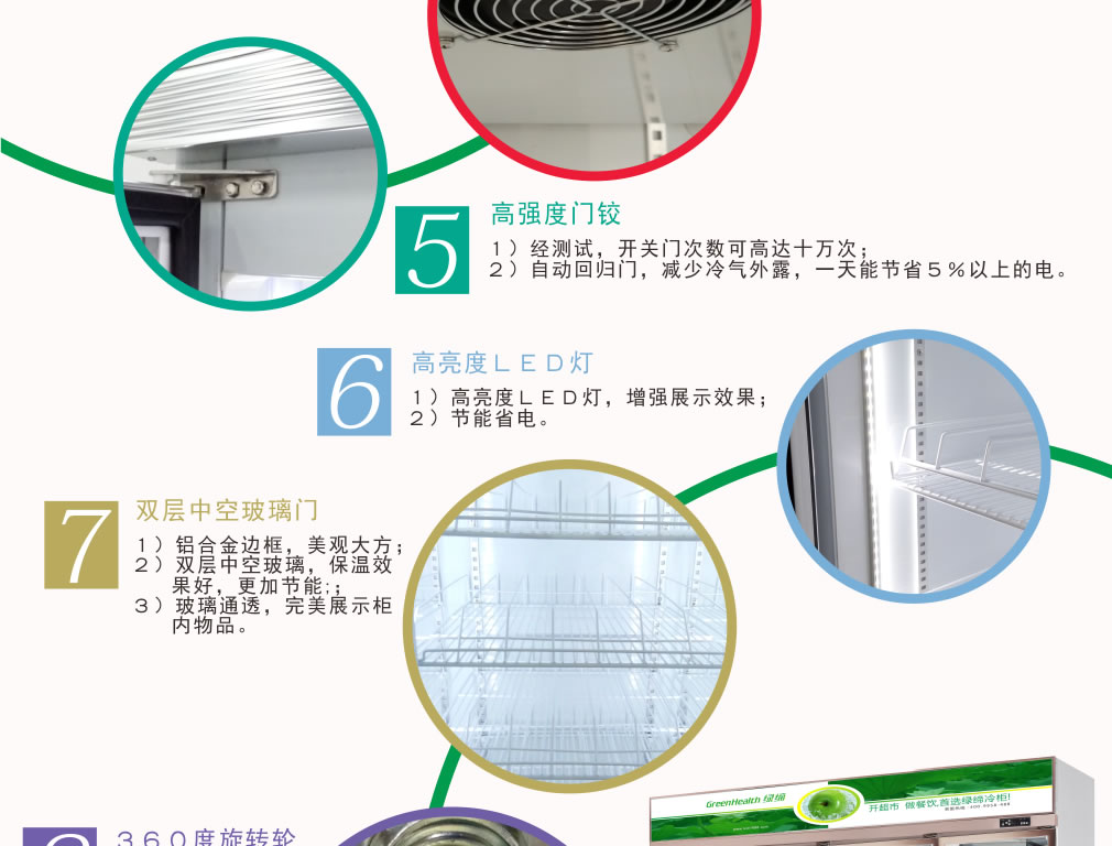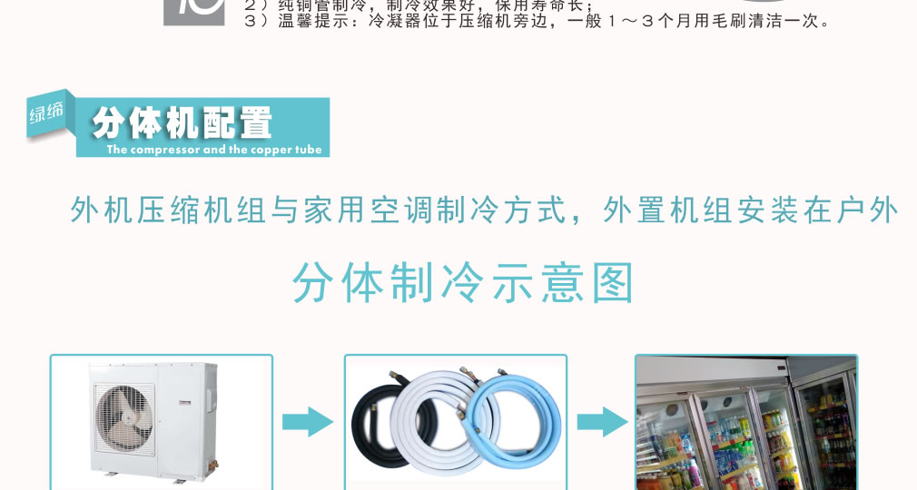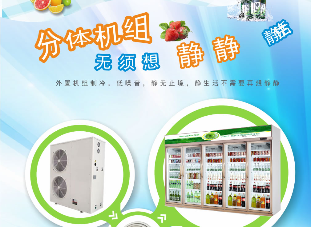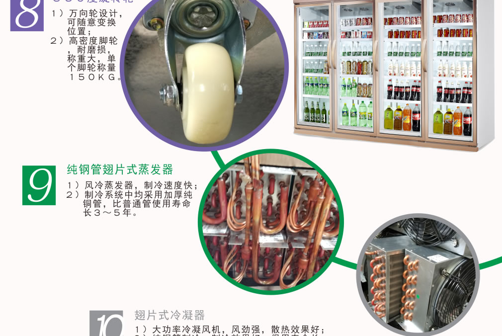 分體機組低澡音全封閉門封,不銹鋼層架勾,微電腦溫控器,EBM冷風(fēng)機,高強度門鉸,高亮度LED燈,雙層中空玻璃門,360度旋轉(zhuǎn)輪,純鋼管翅片式蒸發(fā)器,翅片式冷凝器